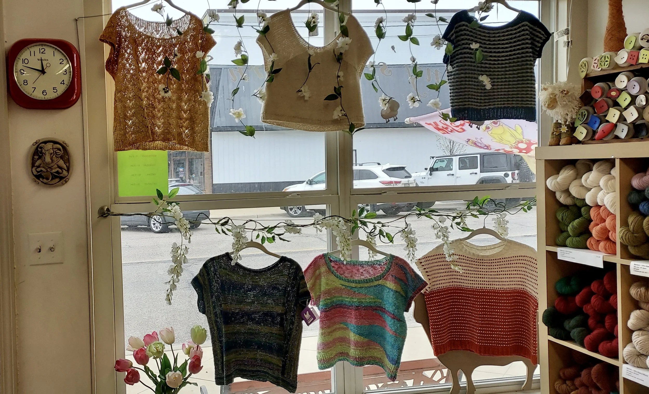 Our Knit Along for May will be SUMMER TOPS. Knitters choice! You get to pick any summer sweater pattern you want and you’ll save 15% on pattern and yarn with our KAL discount. Need some inspiration? Henny was busy while she was in Costa Rica making new samples for the shop with some of the summer fibers we have in stock. Stop by the shop and check them out!