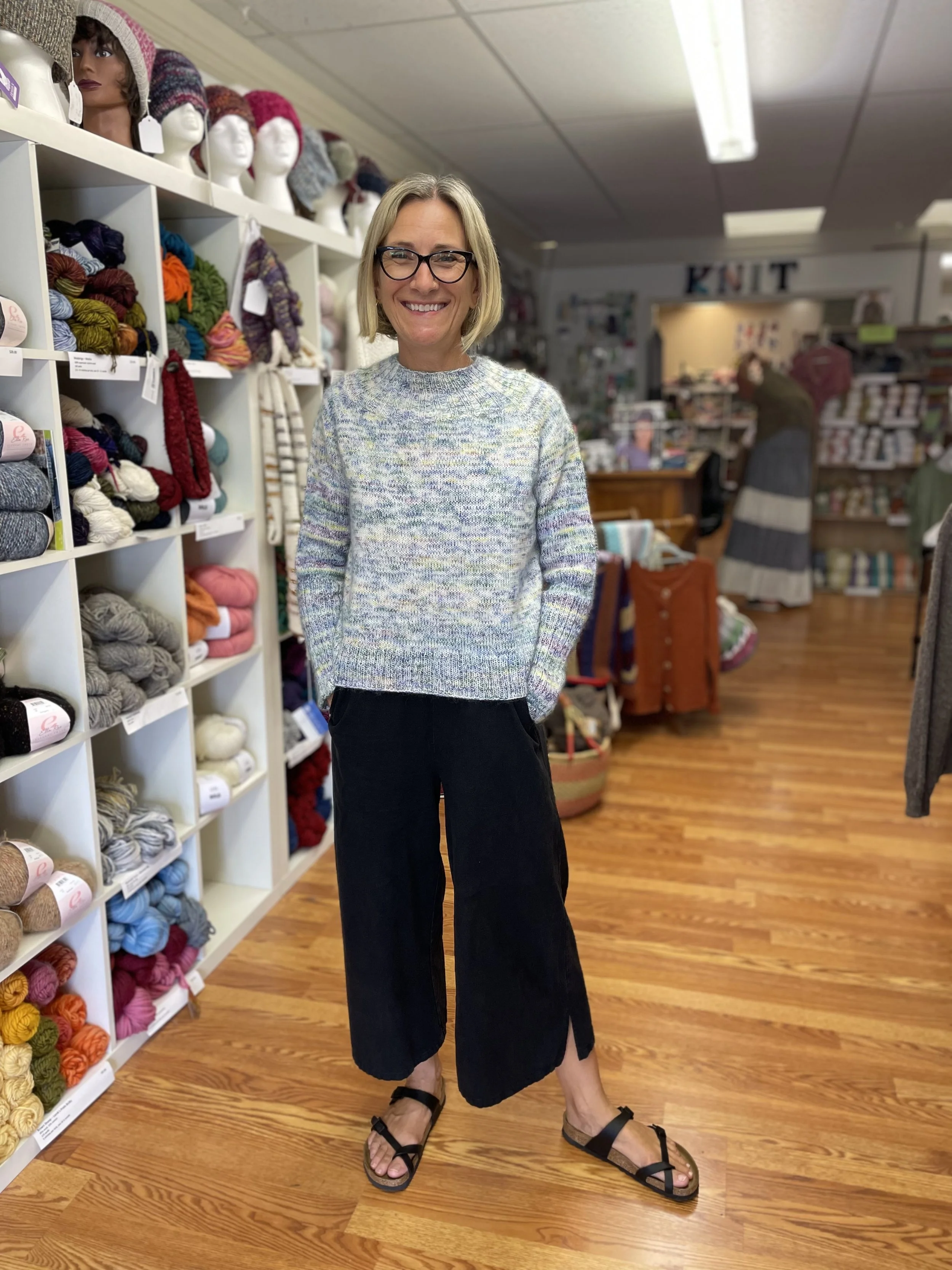 Becky is modeling the No Frills Sweater that Karen knit in two soft shades of grey. The combinations of yarns are endless and we LOVE helping you select the perfect pair for your projects. Stop by the shop so we can play with some color combos for YOU! Also be sure to check out the “projects” link on each Ravelry pattern page for more inspiration ;)
