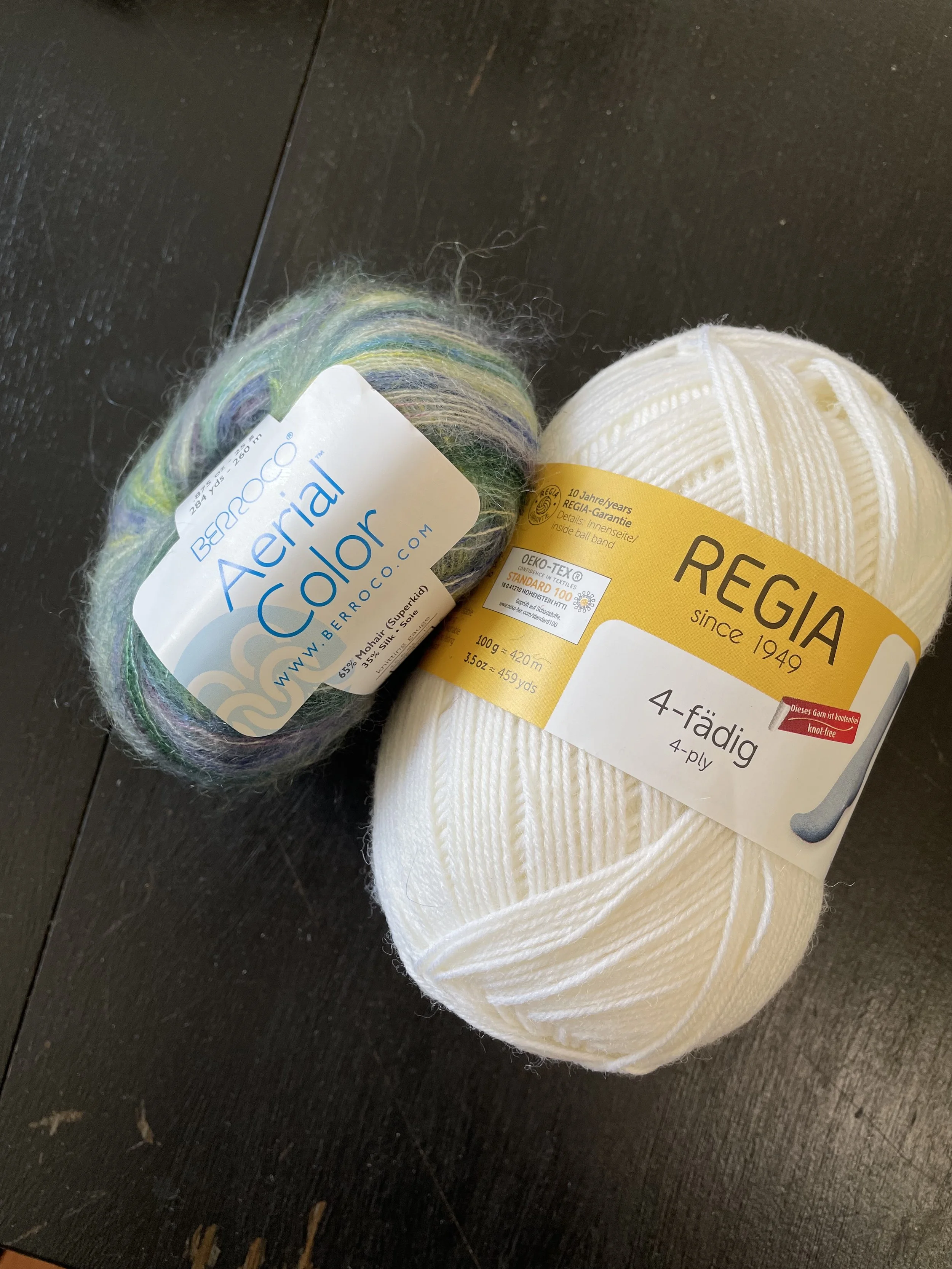 The Calliope that Kristen is wearing was knit with the yarns below… Get a soft variegated effect by combining a colorful mohair with a solid fingering weight.