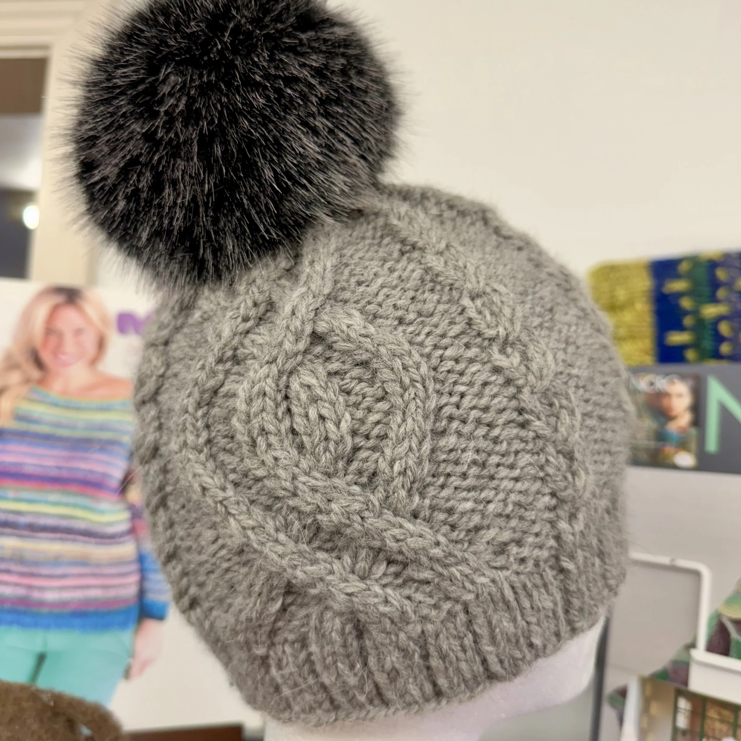 This week’s one skein wonder is a classic cabled hat knit up in a chunky weight yarn. Top it off with a fluffy pompom and it’s the perfect gift knit!