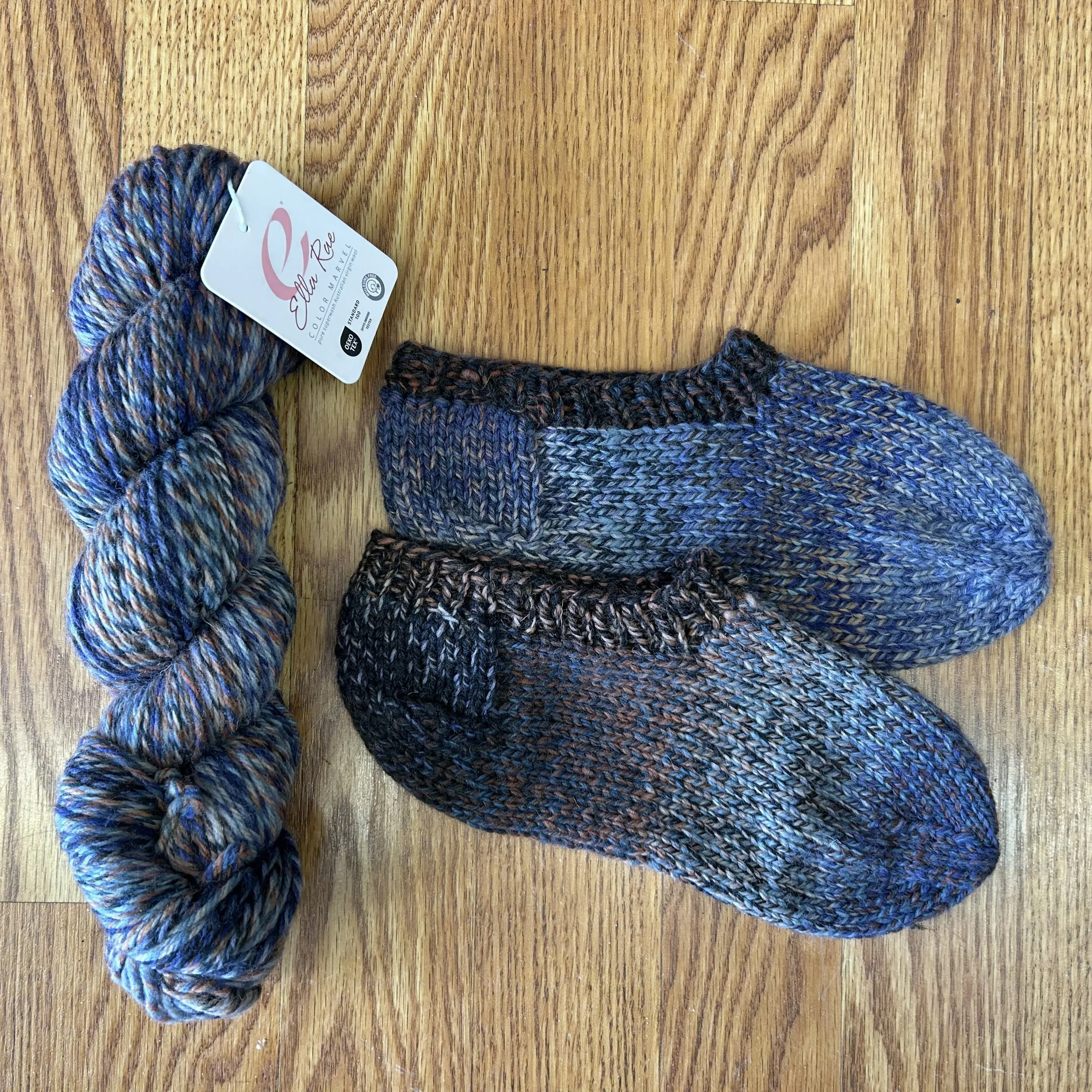 For our second one skein wonder we chose this cozy pair of slippers. Get a cute perfectly mis-matched vibe with this delightful color-shifting yarn.