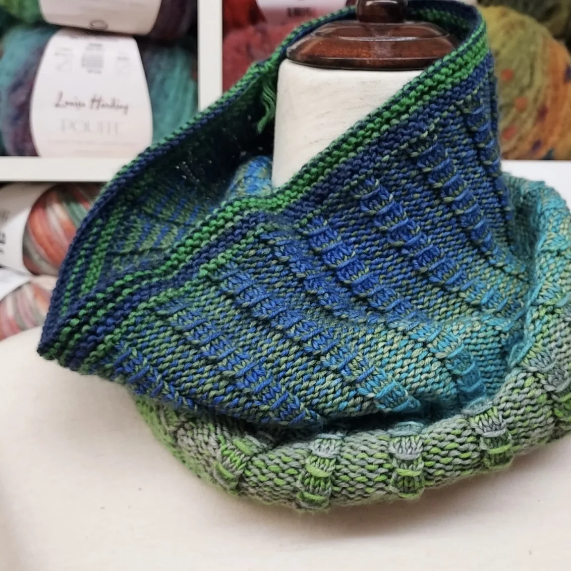 This week’s one skein wonder is an easy cowl, with horizontal slip stitches across vertical ridges. It’s a fast knit project that will add texture and color to a loved one’s winter wardrobe!