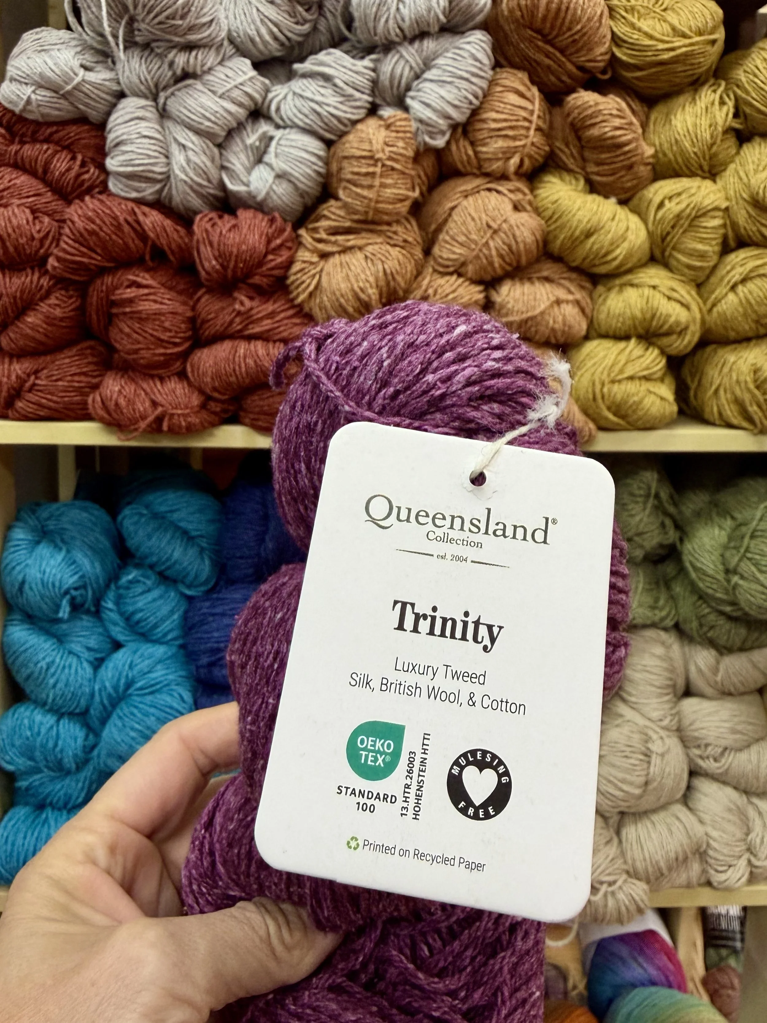 Trinity from Queensland - a 50% Silk, 30% Wool, 20% Cotton blend in DK weight and LOTS of great colors.