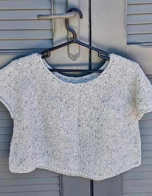 Luminous Summer is a simple tee worked from the top down. It has minimalistic finishing with a row of eyelets delicately framing the face. It has a unique placement of short rows that shapes the neck without disrupting the neckline. This cropped tee uses very little yarn, making it the perfect project to indulge in exquisite yarns.