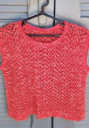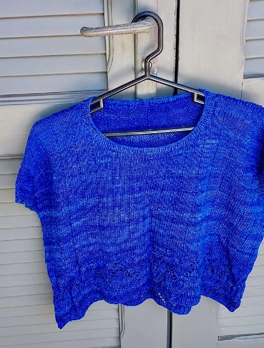 The Tilly Tee is knit flat in pieces. The front and back are seamed at the shoulders and sides; stitches are picked up around the neckline and armhole edges for finishing. This one is made with Berroco Iris.